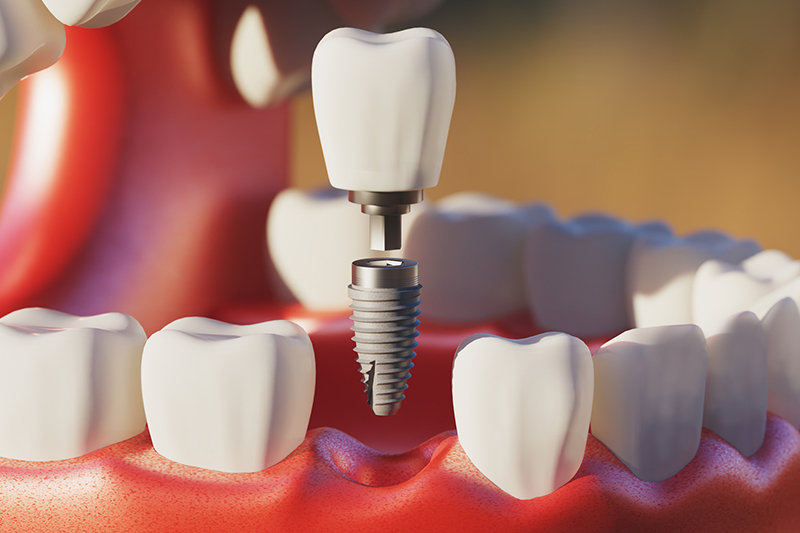 由生物相容性極高的純鈦或鈦合金製成,透過手術植入齒槽骨中,取代被拔除的自然牙根。
